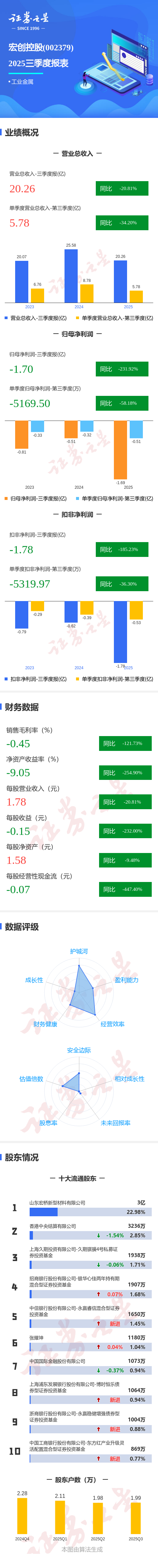 证券之星消息,宏创控股2025年三季报显示,前三季度公司主营收入20.26亿元,同比下降20.82%;归母净利润-1.7亿元,同比下降231.93%;扣非净利润-1.78亿元,同比下降185.24%;其中2025年第三季度,公司单季度主营收入5.78亿元,同比下降34.2%;单季度归母净利润-5169.5万元,同比下降58.18%;单季度扣非净利润-5319.97万元,同比下降36.3%;负债率40.55%,投资收益99.65万元,财务费用992.19万元,毛利率-0.45%。