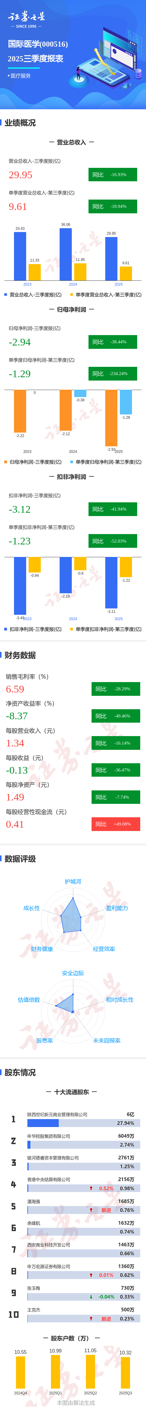 证券之星消息,国际医学2025年三季报显示,前三季度公司主营收入29.95亿元,同比下降16.94%;归母净利润-2.94亿元,同比下降38.45%;扣非净利润-3.12亿元,同比下降41.94%;其中2025年第三季度,公司单季度主营收入9.61亿元,同比下降18.95%;单季度归母净利润-1.29亿元,同比下降234.24%;单季度扣非净利润-1.23亿元,同比下降52.03%;负债率68.8%,投资收益2075.86万元,财务费用1.11亿元,毛利率6.59%。