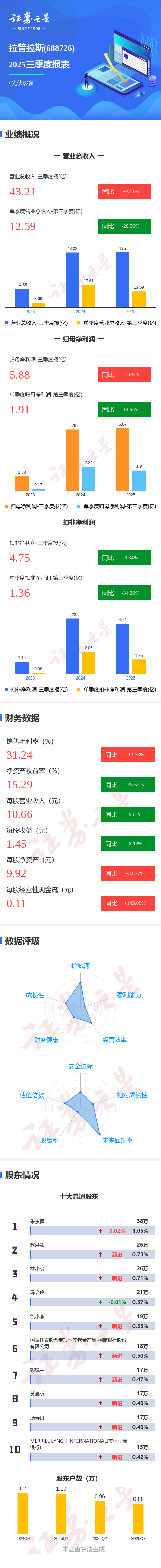 证券之星消息,拉普拉斯2025年三季报显示,前三季度公司主营收入43.21亿元,同比上升0.43%;归母净利润5.88亿元,同比上升2.07%;扣非净利润4.75亿元,同比下降9.35%;其中2025年第三季度,公司单季度主营收入12.59亿元,同比下降28.5%;单季度归母净利润1.91亿元,同比下降14.97%;单季度扣非净利润1.36亿元,同比下降34.2%;负债率60.17%,投资收益4100.61万元,财务费用330.29万元,毛利率31.24%。