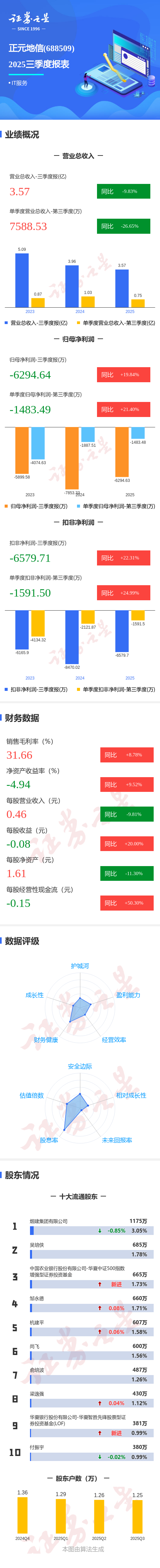 证券之星消息,正元地信2025年三季报显示,前三季度公司主营收入3.57亿元,同比下降9.83%;归母净利润-6294.64万元,同比上升19.85%;扣非净利润-6579.71万元,同比上升22.32%;其中2025年第三季度,公司单季度主营收入7588.53万元,同比下降26.65%;单季度归母净利润-1483.49万元,同比上升21.41%;单季度扣非净利润-1591.5万元,同比上升25.0%;负债率58.61%,投资收益-27.72万元,财务费用499.74万元,毛利率31.66%。