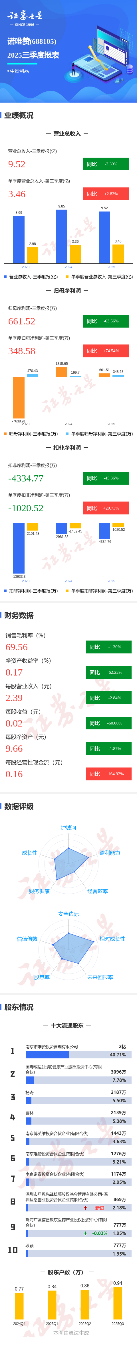 证券之星消息,诺唯赞2025年三季报显示,前三季度公司主营收入9.52亿元,同比下降3.4%;归母净利润661.52万元,同比下降63.57%;扣非净利润-4334.77万元,同比下降45.37%;其中2025年第三季度,公司单季度主营收入3.46亿元,同比上升2.84%;单季度归母净利润348.58万元,同比上升74.55%;单季度扣非净利润-1020.52万元,同比上升29.74%;负债率23.28%,投资收益347.17万元,财务费用332.41万元,毛利率69.56%。