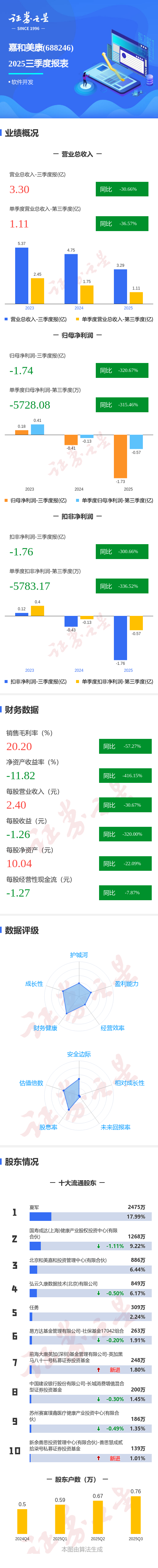 证券之星消息,嘉和美康2025年三季报显示,前三季度公司主营收入3.3亿元,同比下降30.67%;归母净利润-1.74亿元,同比下降320.68%;扣非净利润-1.76亿元,同比下降300.67%;其中2025年第三季度,公司单季度主营收入1.11亿元,同比下降36.57%;单季度归母净利润-5728.08万元,同比下降315.46%;单季度扣非净利润-5783.17万元,同比下降336.53%;负债率40.12%,投资收益-1034.46万元,财务费用747.47万元,毛利率20.2%。