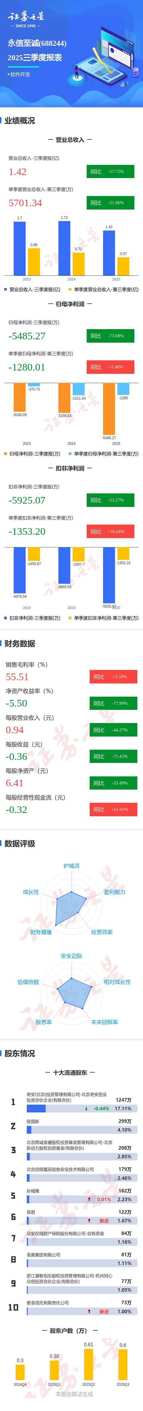 证券之星消息,永信至诚2025年三季报显示,前三季度公司主营收入1.42亿元,同比下降17.72%;归母净利润-5485.27万元,同比下降73.68%;扣非净利润-5925.07万元,同比下降53.28%;其中2025年第三季度,公司单季度主营收入5701.34万元,同比下降21.66%;单季度归母净利润-1280.01万元,同比上升2.4%;单季度扣非净利润-1353.2万元,同比上升10.25%;负债率12.89%,投资收益305.94万元,财务费用-52.1万元,毛利率55.51%。
