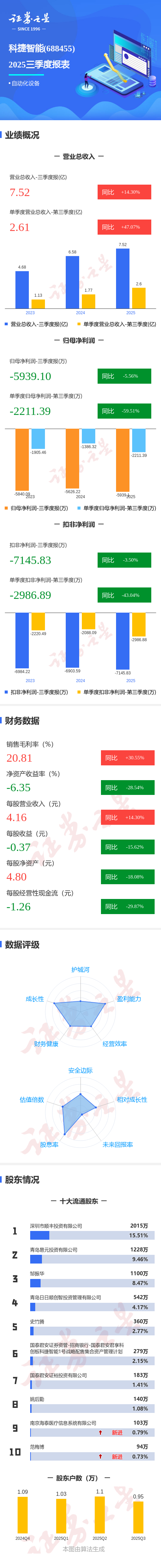 证券之星消息,科捷智能2025年三季报显示,前三季度公司主营收入7.52亿元,同比上升14.31%;归母净利润-5939.1万元,同比下降5.56%;扣非净利润-7145.83万元,同比下降3.51%;其中2025年第三季度,公司单季度主营收入2.61亿元,同比上升47.08%;单季度归母净利润-2211.39万元,同比下降59.51%;单季度扣非净利润-2986.89万元,同比下降43.04%;负债率77.59%,投资收益424.86万元,财务费用673.49万元,毛利率20.81%。