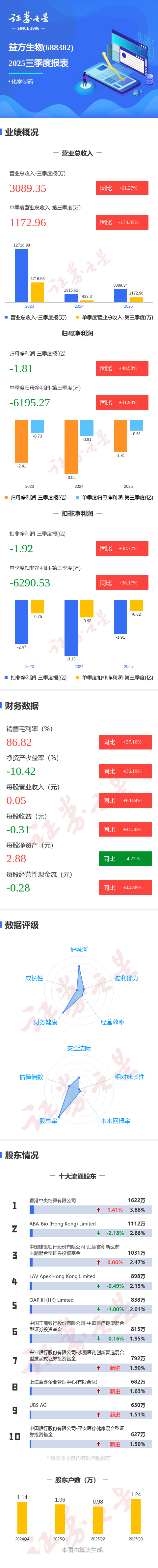 证券之星消息,益方生物2025年三季报显示,前三季度公司主营收入3089.35万元,同比上升61.27%;归母净利润-1.81亿元,同比上升40.59%;扣非净利润-1.92亿元,同比上升38.72%;其中2025年第三季度,公司单季度主营收入1172.96万元,同比上升173.86%;单季度归母净利润-6195.27万元,同比上升31.99%;单季度扣非净利润-6290.53万元,同比上升36.17%;负债率5.61%,投资收益47.8万元,财务费用-2034.52万元,毛利率86.82%。