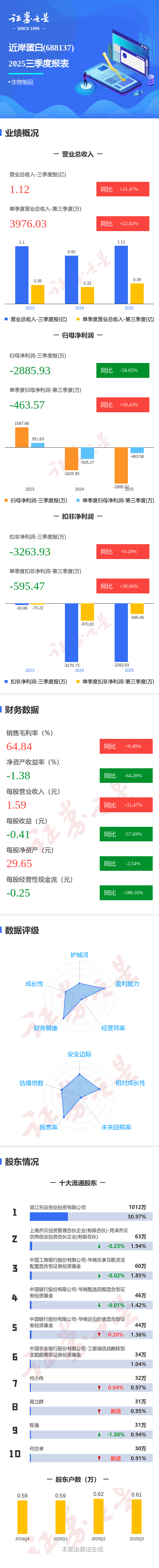 证券之星消息,近岸蛋白2025年三季报显示,前三季度公司主营收入1.12亿元,同比上升21.48%;归母净利润-2885.93万元,同比下降58.06%;扣非净利润-3263.93万元,同比上升0.21%;其中2025年第三季度,公司单季度主营收入3976.03万元,同比上升22.63%;单季度归母净利润-463.57万元,同比上升50.43%;单季度扣非净利润-595.47万元,同比上升38.66%;负债率5.23%,投资收益26.75万元,财务费用-2200.94万元,毛利率64.84%。