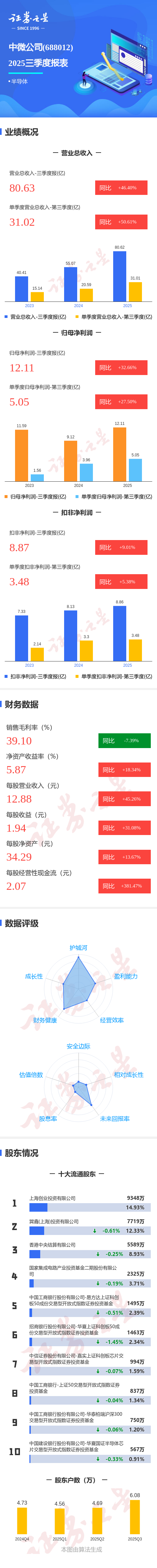 证券之星消息,中微公司2025年三季报显示,前三季度公司主营收入80.63亿元,同比上升46.4%;归母净利润12.11亿元,同比上升32.66%;扣非净利润8.87亿元,同比上升9.01%;其中2025年第三季度,公司单季度主营收入31.02亿元,同比上升50.62%;单季度归母净利润5.05亿元,同比上升27.5%;单季度扣非净利润3.48亿元,同比上升5.38%;负债率28.02%,投资收益6854.0万元,财务费用-4499.62万元,毛利率39.1%。