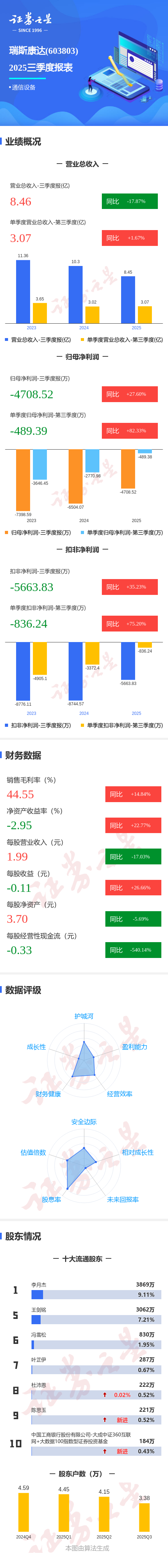 证券之星消息,瑞斯康达2025年三季报显示,前三季度公司主营收入8.46亿元,同比下降17.88%;归母净利润-4708.52万元,同比上升27.61%;扣非净利润-5663.83万元,同比上升35.23%;其中2025年第三季度,公司单季度主营收入3.07亿元,同比上升1.68%;单季度归母净利润-489.39万元,同比上升82.34%;单季度扣非净利润-836.24万元,同比上升75.2%;负债率36.48%,投资收益11.53万元,财务费用400.6万元,毛利率44.55%。