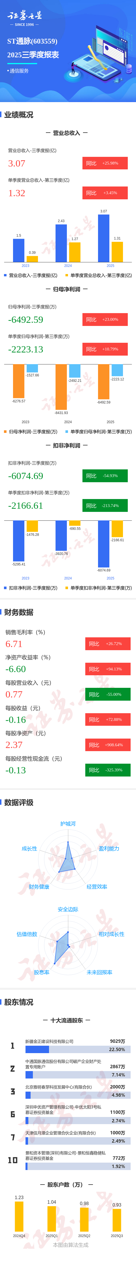 证券之星消息,ST通脉2025年三季报显示,前三季度公司主营收入3.07亿元,同比上升25.99%;归母净利润-6492.59万元,同比上升23.0%;扣非净利润-6074.69万元,同比下降54.94%;其中2025年第三季度,公司单季度主营收入1.32亿元,同比上升3.45%;单季度归母净利润-2223.13万元,同比上升10.8%;单季度扣非净利润-2166.61万元,同比下降213.75%;负债率35.99%,财务费用-82.65万元,毛利率6.71%。