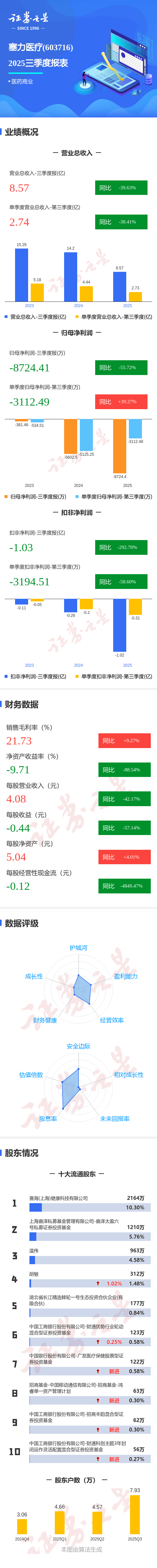 证券之星消息,塞力医疗2025年三季报显示,前三季度公司主营收入8.57亿元,同比下降39.64%;归母净利润-8724.41万元,同比下降55.72%;扣非净利润-1.03亿元,同比下降292.71%;其中2025年第三季度,公司单季度主营收入2.74亿元,同比下降38.41%;单季度归母净利润-3112.49万元,同比上升39.27%;单季度扣非净利润-3194.51万元,同比下降58.6%;负债率49.61%,投资收益734.33万元,财务费用3498.23万元,毛利率21.73%。