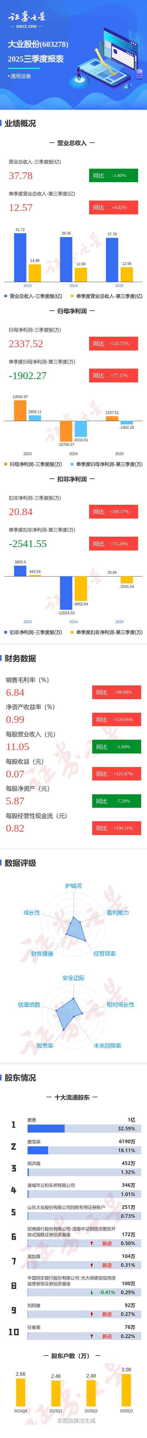 证券之星消息,大业股份2025年三季报显示,前三季度公司主营收入37.78亿元,同比下降1.6%;归母净利润2337.52万元,同比上升121.71%;扣非净利润20.84万元,同比上升100.17%;其中2025年第三季度,公司单季度主营收入12.57亿元,同比上升4.03%;单季度归母净利润-1902.27万元,同比上升77.11%;单季度扣非净利润-2541.55万元,同比上升71.29%;负债率75.26%,投资收益476.25万元,财务费用7930.22万元,毛利率6.84%。