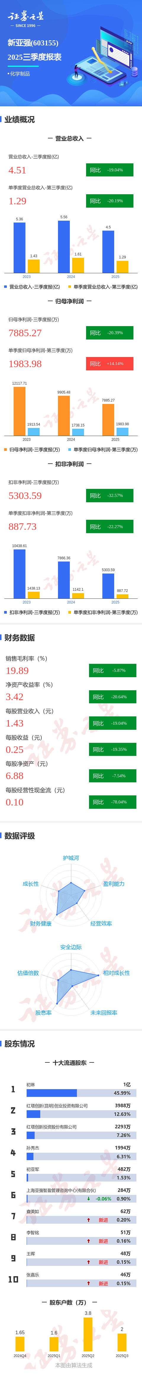 证券之星消息,新亚强2025年三季报显示,前三季度公司主营收入4.51亿元,同比下降19.05%;归母净利润7885.27万元,同比下降20.39%;扣非净利润5303.59万元,同比下降32.58%;其中2025年第三季度,公司单季度主营收入1.29亿元,同比下降20.19%;单季度归母净利润1983.98万元,同比上升14.14%;单季度扣非净利润887.73万元,同比下降22.27%;负债率7.75%,投资收益479.2万元,财务费用-1115.97万元,毛利率19.89%。