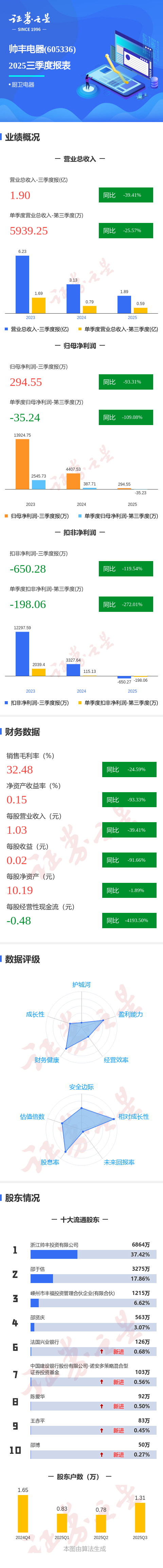 证券之星消息,帅丰电器2025年三季报显示,前三季度公司主营收入1.9亿元,同比下降39.42%;归母净利润294.55万元,同比下降93.32%;扣非净利润-650.28万元,同比下降119.54%;其中2025年第三季度,公司单季度主营收入5939.25万元,同比下降25.57%;单季度归母净利润-35.24万元,同比下降109.09%;单季度扣非净利润-198.06万元,同比下降272.02%;负债率7.83%,投资收益374.91万元,财务费用-1750.72万元,毛利率32.48%。