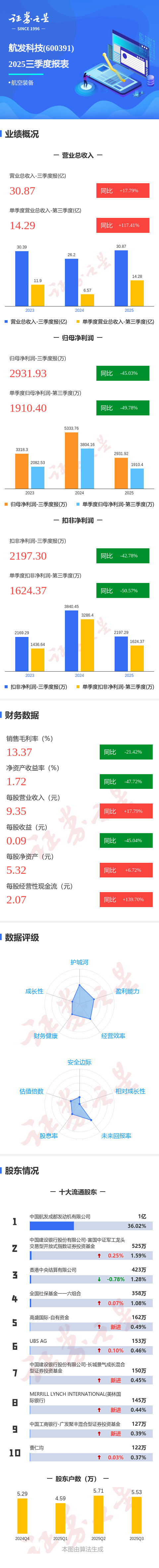 证券之星消息,航发科技2025年三季报显示,前三季度公司主营收入30.87亿元,同比上升17.8%;归母净利润2931.93万元,同比下降45.03%;扣非净利润2197.3万元,同比下降42.79%;其中2025年第三季度,公司单季度主营收入14.29亿元,同比上升117.41%;单季度归母净利润1910.4万元,同比下降49.78%;单季度扣非净利润1624.37万元,同比下降50.57%;负债率63.48%,投资收益-49.31万元,财务费用3747.89万元,毛利率13.37%。