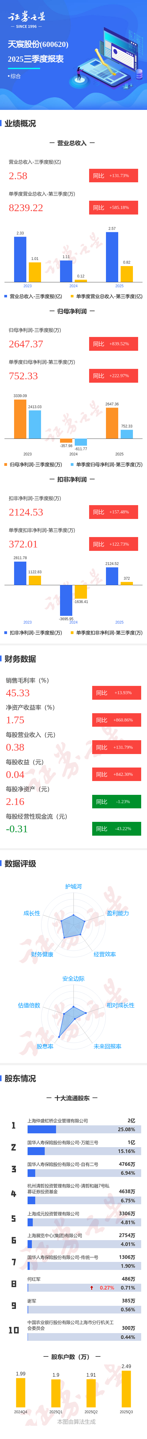 证券之星消息,天宸股份2025年三季报显示,前三季度公司主营收入2.58亿元,同比上升131.73%;归母净利润2647.37万元,同比上升839.53%;扣非净利润2124.53万元,同比上升157.48%;其中2025年第三季度,公司单季度主营收入8239.22万元,同比上升585.18%;单季度归母净利润752.33万元,同比上升222.97%;单季度扣非净利润372.01万元,同比上升122.73%;负债率47.75%,投资收益25.94万元,财务费用492.64万元,毛利率45.33%。