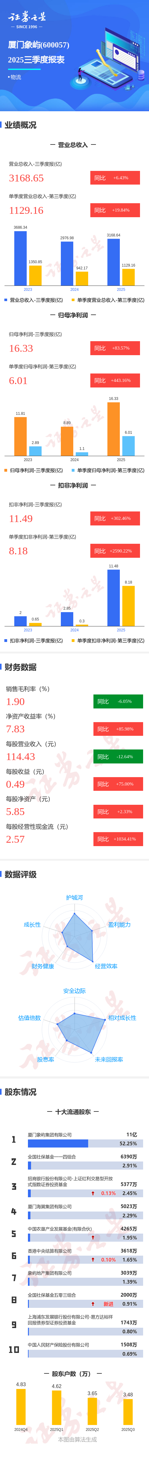 证券之星消息,厦门象屿2025年三季报显示,前三季度公司主营收入3168.65亿元,同比上升6.44%;归母净利润16.33亿元,同比上升83.57%;扣非净利润11.49亿元,同比上升302.47%;其中2025年第三季度,公司单季度主营收入1129.16亿元,同比上升19.85%;单季度归母净利润6.01亿元,同比上升443.17%;单季度扣非净利润8.18亿元,同比上升2590.22%;负债率71.55%,投资收益7884.42万元,财务费用9.07亿元,毛利率1.9%。