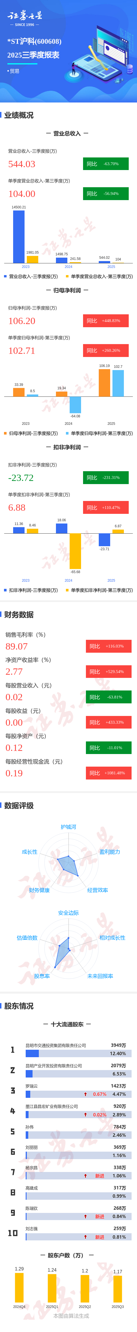 证券之星消息,*ST沪科2025年三季报显示,前三季度公司主营收入544.03万元,同比下降63.7%;归母净利润106.2万元,同比上升448.84%;扣非净利润-23.72万元,同比下降231.31%;其中2025年第三季度,公司单季度主营收入104.0万元,同比下降56.95%;单季度归母净利润102.71万元,同比上升260.26%;单季度扣非净利润6.88万元,同比上升110.47%;负债率65.94%,财务费用180.67万元,毛利率89.07%。