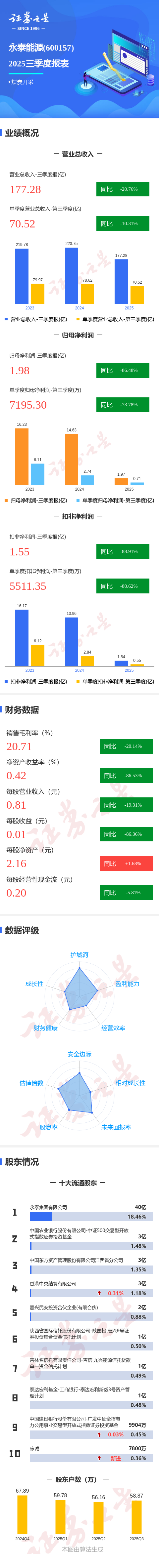 证券之星消息,永泰能源2025年三季报显示,前三季度公司主营收入177.28亿元,同比下降20.77%;归母净利润1.98亿元,同比下降86.48%;扣非净利润1.55亿元,同比下降88.92%;其中2025年第三季度,公司单季度主营收入70.52亿元,同比下降10.31%;单季度归母净利润7195.3万元,同比下降73.78%;单季度扣非净利润5511.35万元,同比下降80.63%;负债率51.91%,投资收益5055.31万元,财务费用13.64亿元,毛利率20.71%。
