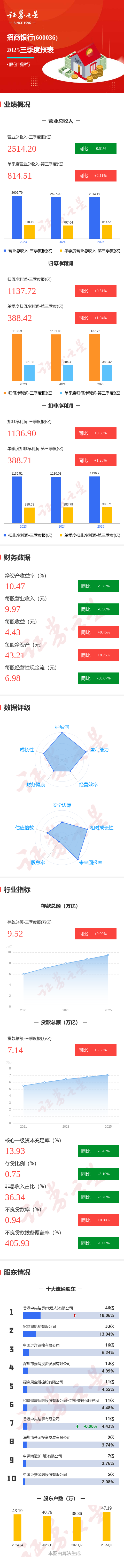 证券之星消息,招商银行2025年三季报显示,前三季度公司主营收入2514.2亿元,同比下降0.51%;归母净利润1137.72亿元,同比上升0.52%;扣非净利润1136.9亿元,同比上升0.61%;其中2025年第三季度,公司单季度主营收入814.51亿元,同比上升2.11%;单季度归母净利润388.42亿元,同比上升1.04%;单季度扣非净利润388.71亿元,同比上升1.28%;负债率89.92%,投资收益302.52亿元。