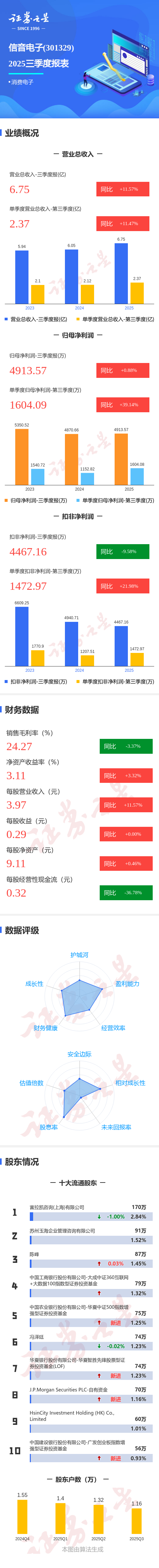 证券之星消息,信音电子2025年三季报显示,前三季度公司主营收入6.75亿元,同比上升11.57%;归母净利润4913.57万元,同比上升0.88%;扣非净利润4467.16万元,同比下降9.58%;其中2025年第三季度,公司单季度主营收入2.37亿元,同比上升11.48%;单季度归母净利润1604.09万元,同比上升39.14%;单季度扣非净利润1472.97万元,同比上升21.98%;负债率16.68%,投资收益558.53万元,财务费用-458.7万元,毛利率24.27%。
