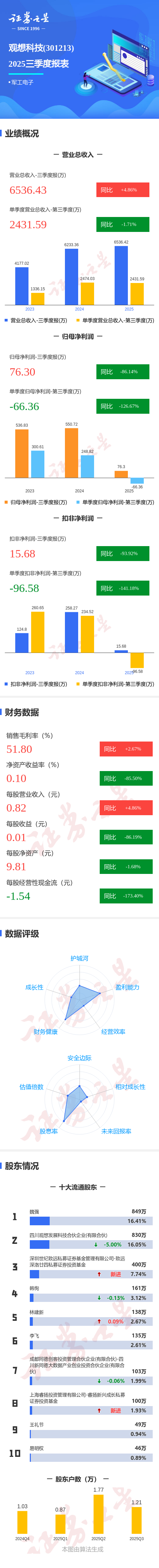 证券之星消息,观想科技2025年三季报显示,前三季度公司主营收入6536.43万元,同比上升4.86%;归母净利润76.3万元,同比下降86.14%;扣非净利润15.68万元,同比下降93.93%;其中2025年第三季度,公司单季度主营收入2431.59万元,同比下降1.72%;单季度归母净利润-66.36万元,同比下降126.67%;单季度扣非净利润-96.58万元,同比下降141.18%;负债率19.98%,投资收益-2.77万元,财务费用65.76万元,毛利率51.8%。