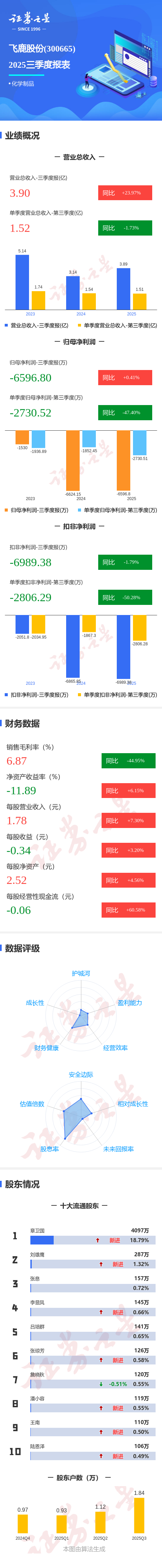 证券之星消息,飞鹿股份2025年三季报显示,前三季度公司主营收入3.9亿元,同比上升23.98%;归母净利润-6596.8万元,同比上升0.41%;扣非净利润-6989.38万元,同比下降1.8%;其中2025年第三季度,公司单季度主营收入1.52亿元,同比下降1.74%;单季度归母净利润-2730.52万元,同比下降47.4%;单季度扣非净利润-2806.29万元,同比下降50.29%;负债率67.56%,投资收益287.36万元,财务费用2499.44万元,毛利率6.87%。