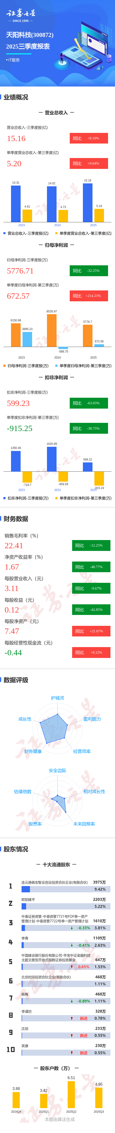 证券之星消息,天阳科技2025年三季报显示,前三季度公司主营收入15.16亿元,同比上升8.11%;归母净利润5776.71万元,同比下降32.25%;扣非净利润599.23万元,同比下降63.03%;其中2025年第三季度,公司单季度主营收入5.2亿元,同比上升9.64%;单季度归母净利润672.57万元,同比上升214.24%;单季度扣非净利润-915.25万元,同比下降38.76%;负债率16.68%,投资收益145.39万元,财务费用583.86万元,毛利率22.41%。