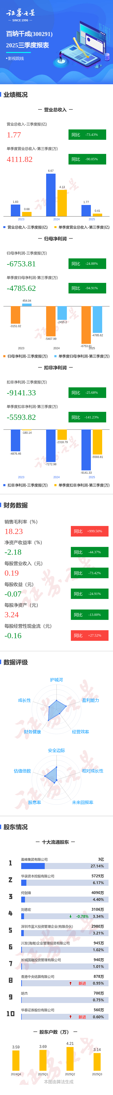 证券之星消息,百纳千成2025年三季报显示,前三季度公司主营收入1.77亿元,同比下降73.43%;归母净利润-6753.81万元,同比下降24.89%;扣非净利润-9141.33万元,同比下降25.69%;其中2025年第三季度,公司单季度主营收入4111.82万元,同比下降90.05%;单季度归母净利润-4785.62万元,同比下降94.92%;单季度扣非净利润-5593.82万元,同比下降141.24%;负债率23.48%,投资收益1861.0万元,财务费用206.48万元,毛利率18.23%。