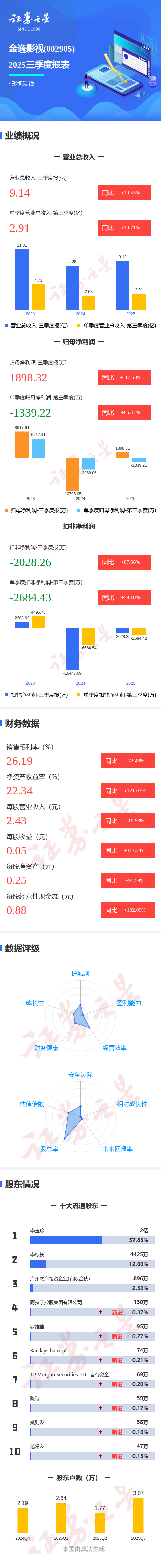 证券之星消息,金逸影视2025年三季报显示,前三季度公司主营收入9.14亿元,同比上升10.54%;归母净利润1898.32万元,同比上升117.58%;扣非净利润-2028.26万元,同比上升87.67%;其中2025年第三季度,公司单季度主营收入2.91亿元,同比上升10.71%;单季度归母净利润-1339.22万元,同比上升65.38%;单季度扣非净利润-2684.43万元,同比上升59.11%;负债率96.42%,投资收益136.38万元,财务费用6584.9万元,毛利率26.19%。