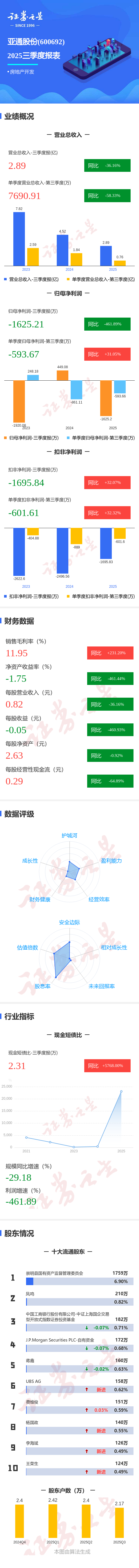 证券之星消息,亚通股份2025年三季报显示,前三季度公司主营收入2.89亿元,同比下降36.16%;归母净利润-1625.21万元,同比下降461.89%;扣非净利润-1695.84万元,同比上升32.07%;其中2025年第三季度,公司单季度主营收入7690.91万元,同比下降58.33%;单季度归母净利润-593.67万元,同比上升31.06%;单季度扣非净利润-601.61万元,同比上升32.33%;负债率75.36%,投资收益-17.69万元,财务费用567.06万元,毛利率11.95%。
