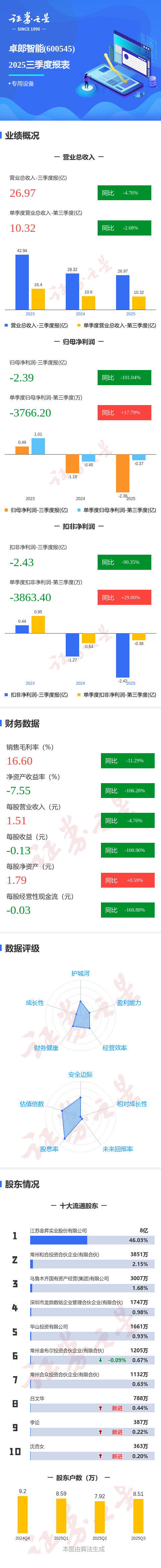 证券之星消息,卓郎智能2025年三季报显示,前三季度公司主营收入26.97亿元,同比下降4.76%;归母净利润-2.39亿元,同比下降101.04%;扣非净利润-2.43亿元,同比下降90.36%;其中2025年第三季度,公司单季度主营收入10.32亿元,同比下降2.68%;单季度归母净利润-3766.2万元,同比上升17.79%;单季度扣非净利润-3863.4万元,同比上升29.01%;负债率56.77%,财务费用1.7亿元,毛利率16.6%。