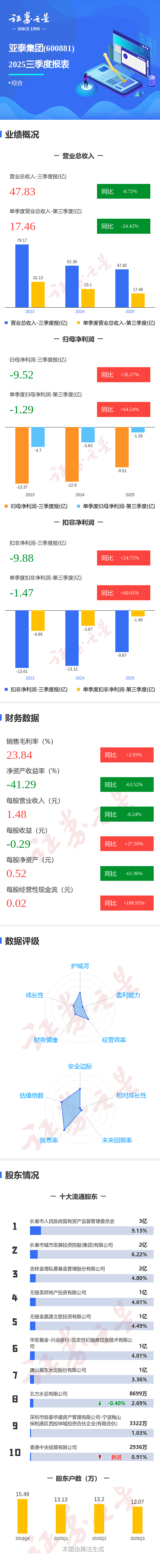 证券之星消息,亚泰集团2025年三季报显示,前三季度公司主营收入47.83亿元,同比下降8.72%;归母净利润-9.52亿元,同比上升26.27%;扣非净利润-9.88亿元,同比上升24.75%;其中2025年第三季度,公司单季度主营收入17.46亿元,同比下降24.43%;单季度归母净利润-1.29亿元,同比上升64.55%;单季度扣非净利润-1.47亿元,同比上升60.01%;负债率95.24%,投资收益4.93亿元,财务费用13.56亿元,毛利率23.84%。