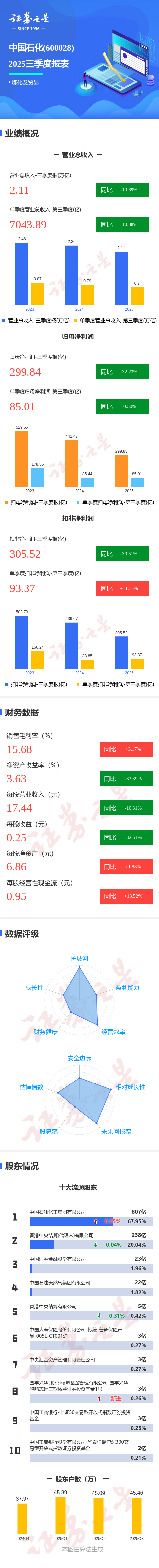 证券之星消息,中国石化2025年三季报显示,前三季度公司主营收入21134.41亿元,同比下降10.69%;归母净利润299.84亿元,同比下降32.23%;扣非净利润305.52亿元,同比下降30.51%;其中2025年第三季度,公司单季度主营收入7043.89亿元,同比下降10.88%;单季度归母净利润85.01亿元,同比下降0.5%;单季度扣非净利润93.37亿元,同比上升11.35%;负债率54.69%,投资收益73.42亿元,财务费用112.5亿元,毛利率15.68%。
