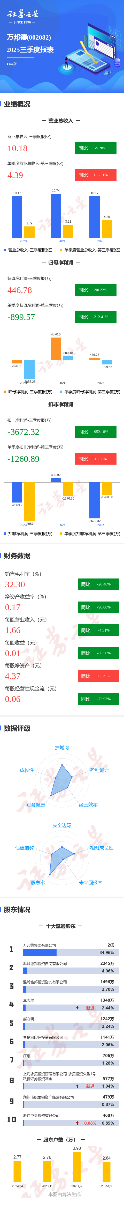证券之星消息,万邦德2025年三季报显示,前三季度公司主营收入10.18亿元,同比下降5.28%;归母净利润446.78万元,同比下降90.22%;扣非净利润-3672.32万元,同比下降952.19%;其中2025年第三季度,公司单季度主营收入4.39亿元,同比上升36.51%;单季度归母净利润-899.57万元,同比下降212.42%;单季度扣非净利润-1260.89万元,同比上升8.39%;负债率39.09%,投资收益0.0万元,财务费用2333.37万元,毛利率32.3%。