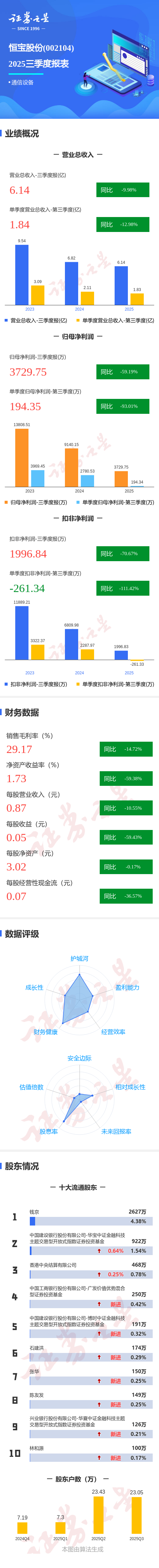 证券之星消息,恒宝股份2025年三季报显示,前三季度公司主营收入6.14亿元,同比下降9.99%;归母净利润3729.75万元,同比下降59.19%;扣非净利润1996.84万元,同比下降70.68%;其中2025年第三季度,公司单季度主营收入1.84亿元,同比下降12.99%;单季度归母净利润194.35万元,同比下降93.01%;单季度扣非净利润-261.34万元,同比下降111.42%;负债率10.34%,投资收益1323.7万元,财务费用-298.72万元,毛利率29.17%。