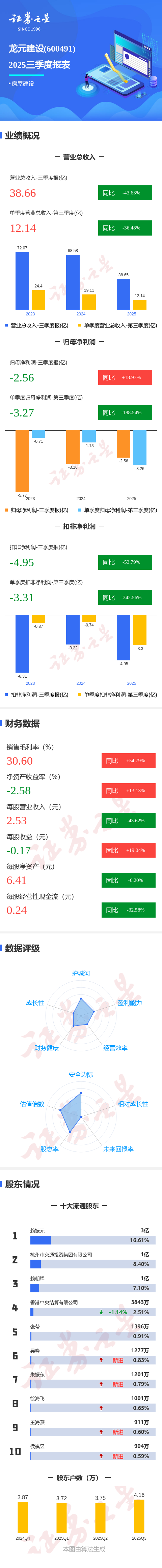证券之星消息,龙元建设2025年三季报显示,前三季度公司主营收入38.66亿元,同比下降43.63%;归母净利润-2.56亿元,同比上升18.94%;扣非净利润-4.95亿元,同比下降53.79%;其中2025年第三季度,公司单季度主营收入12.14亿元,同比下降36.48%;单季度归母净利润-3.27亿元,同比下降188.54%;单季度扣非净利润-3.31亿元,同比下降342.56%;负债率79.17%,投资收益-1391.18万元,财务费用10.6亿元,毛利率30.6%。