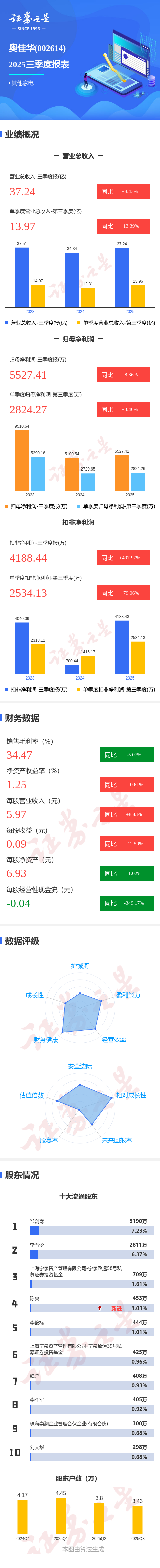 证券之星消息,奥佳华2025年三季报显示,前三季度公司主营收入37.24亿元,同比上升8.43%;归母净利润5527.41万元,同比上升8.37%;扣非净利润4188.44万元,同比上升497.97%;其中2025年第三季度,公司单季度主营收入13.97亿元,同比上升13.4%;单季度归母净利润2824.27万元,同比上升3.47%;单季度扣非净利润2534.13万元,同比上升79.07%;负债率41.72%,投资收益1264.25万元,财务费用-4267.1万元,毛利率34.47%。