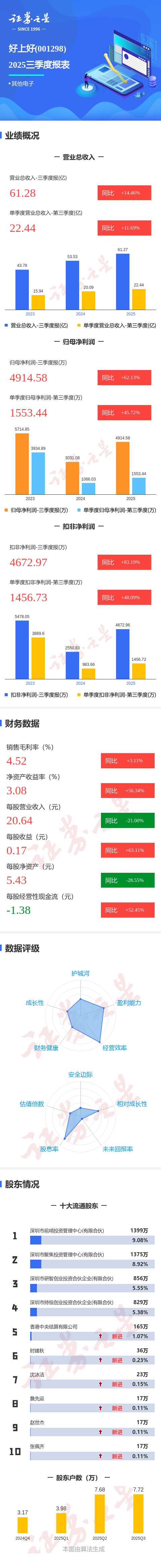 证券之星消息,好上好2025年三季报显示,前三季度公司主营收入61.28亿元,同比上升14.46%;归母净利润4914.58万元,同比上升62.14%;扣非净利润4672.97万元,同比上升83.19%;其中2025年第三季度,公司单季度主营收入22.44亿元,同比上升11.69%;单季度归母净利润1553.44万元,同比上升45.72%;单季度扣非净利润1456.73万元,同比上升48.09%;负债率55.73%,投资收益186.91万元,财务费用3440.76万元,毛利率4.52%。
