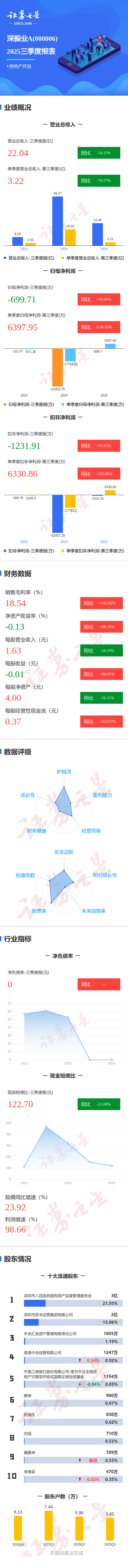 证券之星消息,深振业A2025年三季报显示,前三季度公司主营收入22.04亿元,同比下降54.34%;归母净利润-699.71万元,同比上升98.66%;扣非净利润-1231.91万元,同比上升97.65%;其中2025年第三季度,公司单季度主营收入3.22亿元,同比下降79.78%;单季度归母净利润6397.95万元,同比上升136.04%;单季度扣非净利润6330.86万元,同比上升135.6%;负债率64.22%,投资收益101.64万元,财务费用1.03亿元,毛利率18.54%。