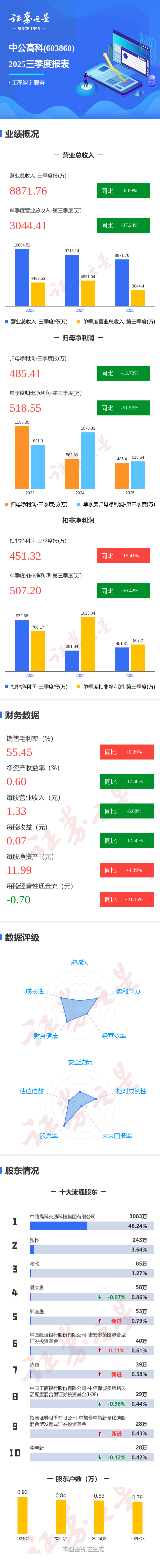 证券之星消息,中公高科2025年三季报显示,前三季度公司主营收入8871.76万元,同比下降8.69%;归母净利润485.41万元,同比下降13.73%;扣非净利润451.32万元,同比上升15.41%;其中2025年第三季度,公司单季度主营收入3044.41万元,同比下降37.24%;单季度归母净利润518.55万元,同比下降51.55%;单季度扣非净利润507.2万元,同比下降50.42%;负债率12.62%,财务费用-213.19万元,毛利率55.45%。