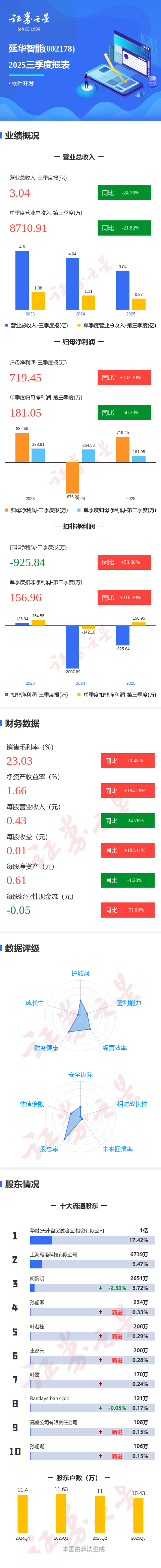 证券之星消息,延华智能2025年三季报显示,前三季度公司主营收入3.04亿元,同比下降24.77%;归母净利润719.45万元,同比上升182.1%;扣非净利润-925.84万元,同比上升53.89%;其中2025年第三季度,公司单季度主营收入8710.91万元,同比下降21.82%;单季度归母净利润181.05万元,同比下降50.33%;单季度扣非净利润156.96万元,同比上升210.39%;负债率60.0%,投资收益2174.1万元,财务费用240.35万元,毛利率23.03%。