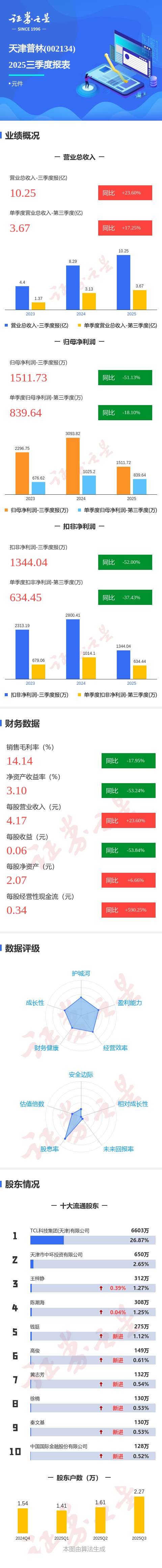 证券之星消息,天津普林2025年三季报显示,前三季度公司主营收入10.25亿元,同比上升23.61%;归母净利润1511.73万元,同比下降51.14%;扣非净利润1344.04万元,同比下降52.01%;其中2025年第三季度,公司单季度主营收入3.67亿元,同比上升17.25%;单季度归母净利润839.64万元,同比下降18.1%;单季度扣非净利润634.45万元,同比下降37.44%;负债率62.92%,投资收益154.06万元,财务费用1014.87万元,毛利率14.14%。