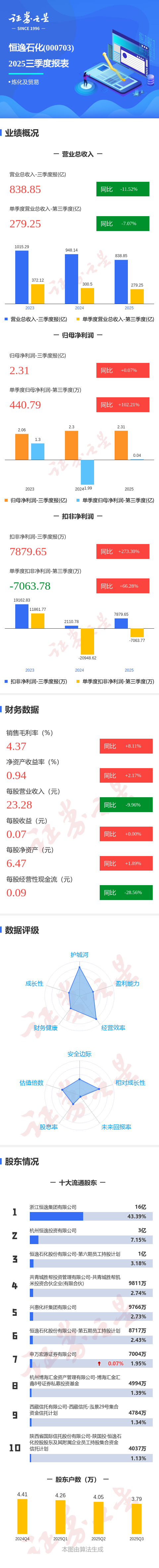 证券之星消息,恒逸石化2025年三季报显示,前三季度公司主营收入838.85亿元,同比下降11.53%;归母净利润2.31亿元,同比上升0.08%;扣非净利润7879.65万元,同比上升273.3%;其中2025年第三季度,公司单季度主营收入279.25亿元,同比下降7.07%;单季度归母净利润440.79万元,同比上升102.21%;单季度扣非净利润-7063.78万元,同比上升66.28%;负债率72.69%,投资收益1.91亿元,财务费用21.4亿元,毛利率4.37%。