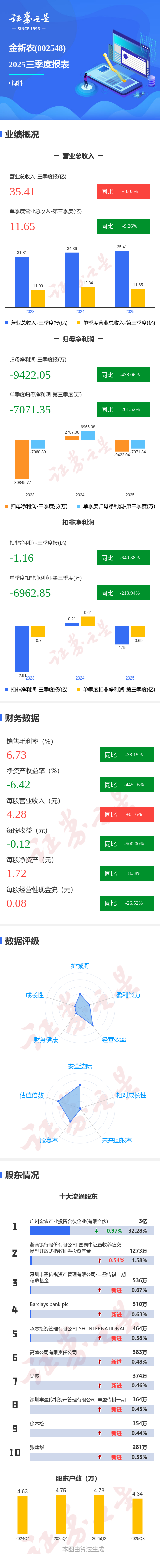 证券之星消息,金新农2025年三季报显示,前三季度公司主营收入35.41亿元,同比上升3.04%;归母净利润-9422.05万元,同比下降438.06%;扣非净利润-1.16亿元,同比下降640.38%;其中2025年第三季度,公司单季度主营收入11.65亿元,同比下降9.26%;单季度归母净利润-7071.35万元,同比下降201.53%;单季度扣非净利润-6962.85万元,同比下降213.95%;负债率72.86%,投资收益-628.71万元,财务费用1.06亿元,毛利率6.73%。