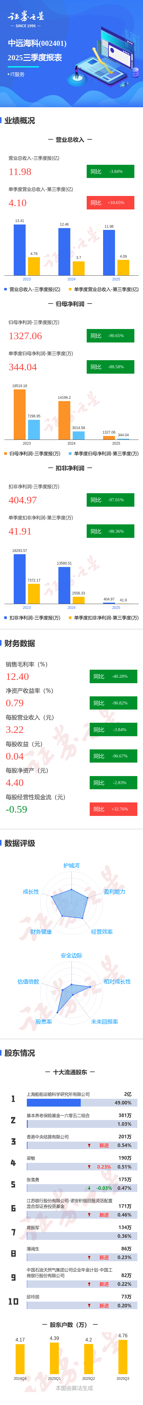 证券之星消息,中远海科2025年三季报显示,前三季度公司主营收入11.98亿元,同比下降3.85%;归母净利润1327.06万元,同比下降90.65%;扣非净利润404.97万元,同比下降97.02%;其中2025年第三季度,公司单季度主营收入4.1亿元,同比上升10.65%;单季度归母净利润344.04万元,同比下降88.59%;单季度扣非净利润41.91万元,同比下降98.36%;负债率41.2%,投资收益1320.29万元,财务费用-1919.56万元,毛利率12.4%。