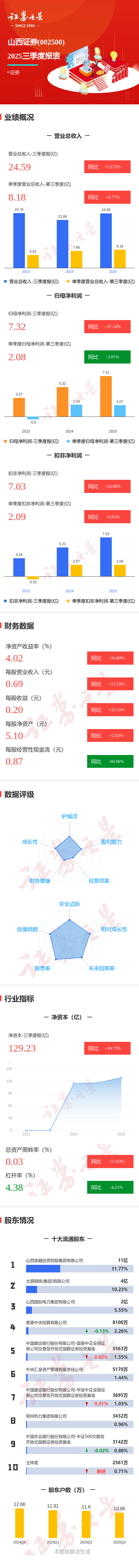 证券之星消息,山西证券2025年三季报显示,前三季度公司主营收入24.59亿元,同比上升13.53%;归母净利润7.32亿元,同比上升37.34%;扣非净利润7.03亿元,同比上升34.81%;其中2025年第三季度,公司单季度主营收入8.18亿元,同比上升6.77%;单季度归母净利润2.08亿元,同比下降3.01%;单季度扣非净利润2.09亿元,同比上升0.81%;负债率77.18%,投资收益11.67亿元。
