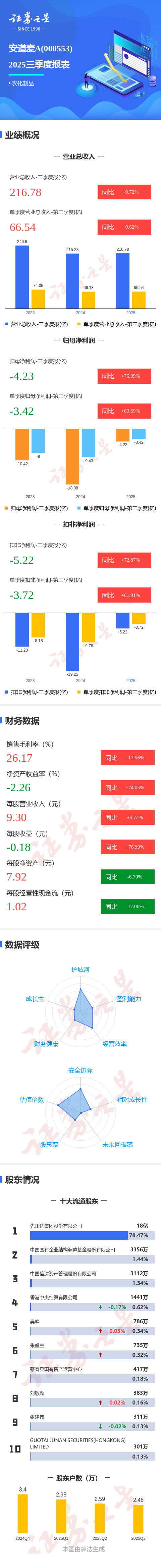 证券之星消息,安道麦A2025年三季报显示,前三季度公司主营收入216.78亿元,同比上升0.72%;归母净利润-4.23亿元,同比上升77.0%;扣非净利润-5.22亿元,同比上升72.87%;其中2025年第三季度,公司单季度主营收入66.54亿元,同比上升0.62%;单季度归母净利润-3.42亿元,同比上升63.69%;单季度扣非净利润-3.72亿元,同比上升61.92%;负债率63.04%,投资收益746.4万元,财务费用15.44亿元,毛利率26.17%。