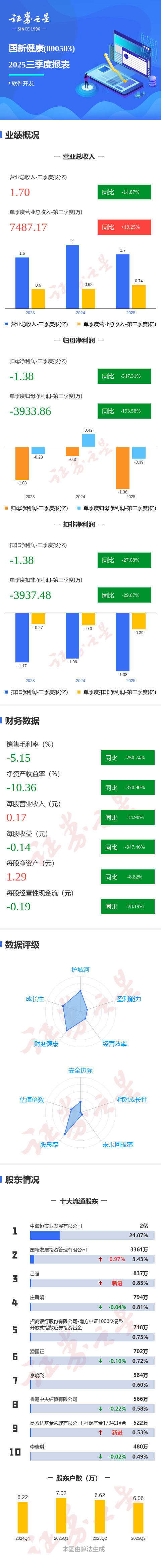 证券之星消息,国新健康2025年三季报显示,前三季度公司主营收入1.7亿元,同比下降14.87%;归母净利润-1.38亿元,同比下降347.32%;扣非净利润-1.38亿元,同比下降27.09%;其中2025年第三季度,公司单季度主营收入7487.17万元,同比上升19.26%;单季度归母净利润-3933.86万元,同比下降193.59%;单季度扣非净利润-3937.48万元,同比下降29.67%;负债率37.02%,投资收益1656.56万元,财务费用653.45万元,毛利率-5.15%。