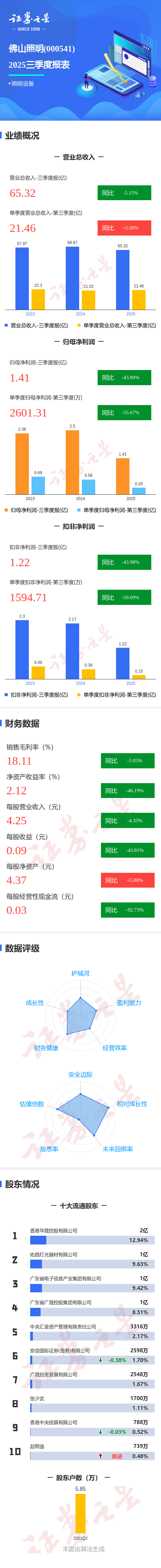 证券之星消息,佛山照明2025年三季报显示,前三季度公司主营收入65.32亿元,同比下降5.16%;归母净利润1.41亿元,同比下降43.8%;扣非净利润1.22亿元,同比下降43.98%;其中2025年第三季度,公司单季度主营收入21.46亿元,同比上升2.08%;单季度归母净利润2601.31万元,同比下降55.68%;单季度扣非净利润1594.71万元,同比下降59.1%;负债率39.36%,投资收益3936.93万元,财务费用-1786.33万元,毛利率18.11%。