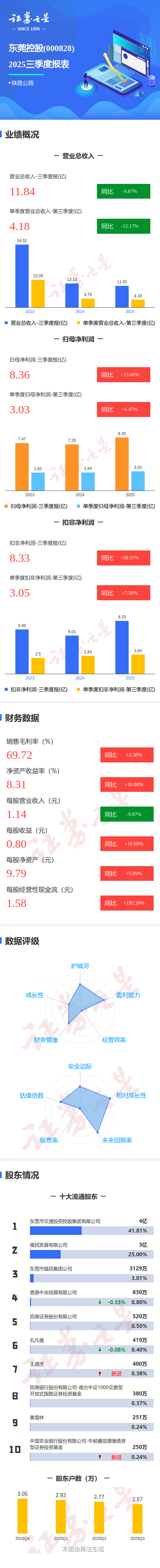 证券之星消息,东莞控股2025年三季报显示,前三季度公司主营收入11.84亿元,同比下降9.88%;归母净利润8.36亿元,同比上升15.01%;扣非净利润8.33亿元,同比上升38.57%;其中2025年第三季度,公司单季度主营收入4.18亿元,同比下降12.18%;单季度归母净利润3.03亿元,同比上升6.47%;单季度扣非净利润3.05亿元,同比上升7.51%;负债率37.15%,投资收益2.36亿元,财务费用-29.8万元,毛利率69.72%。